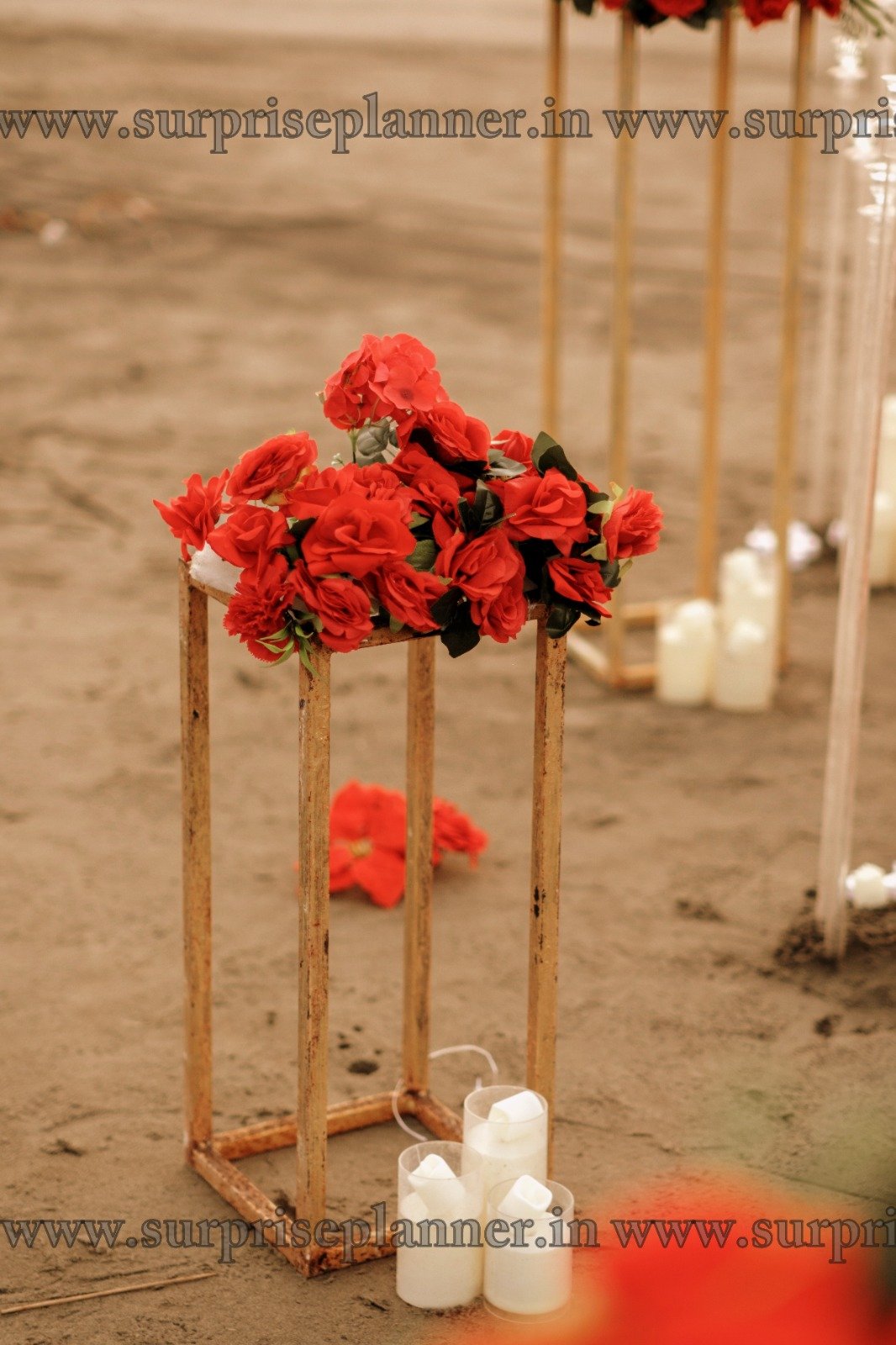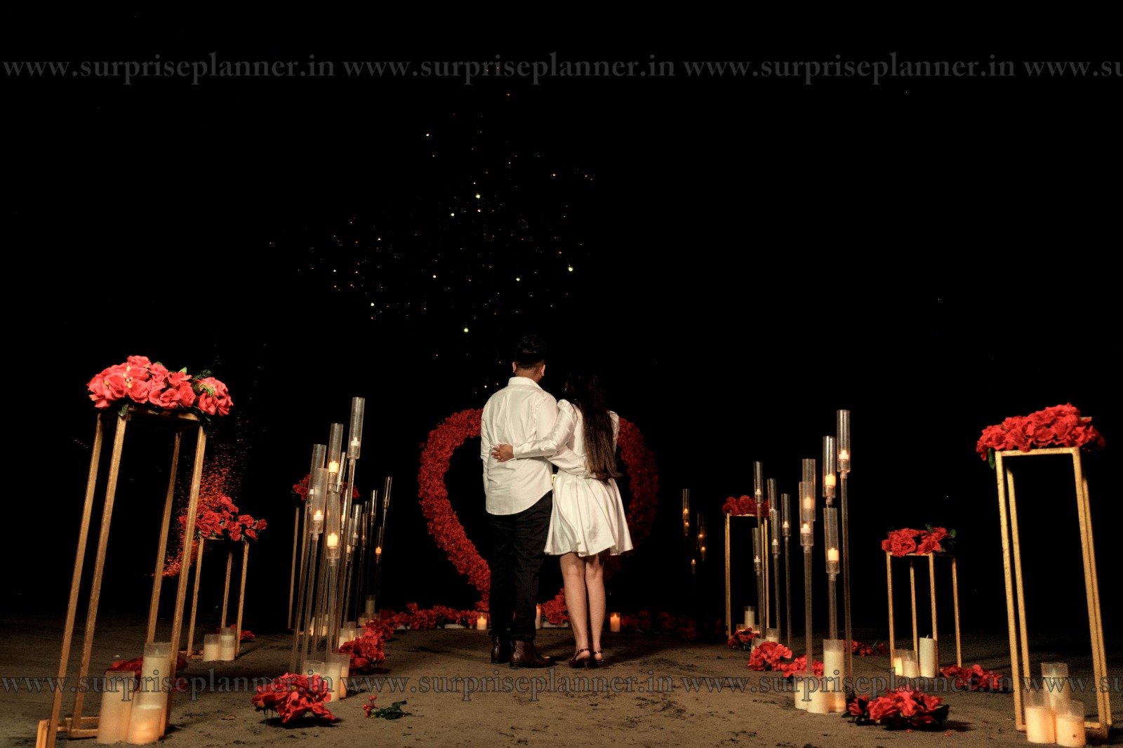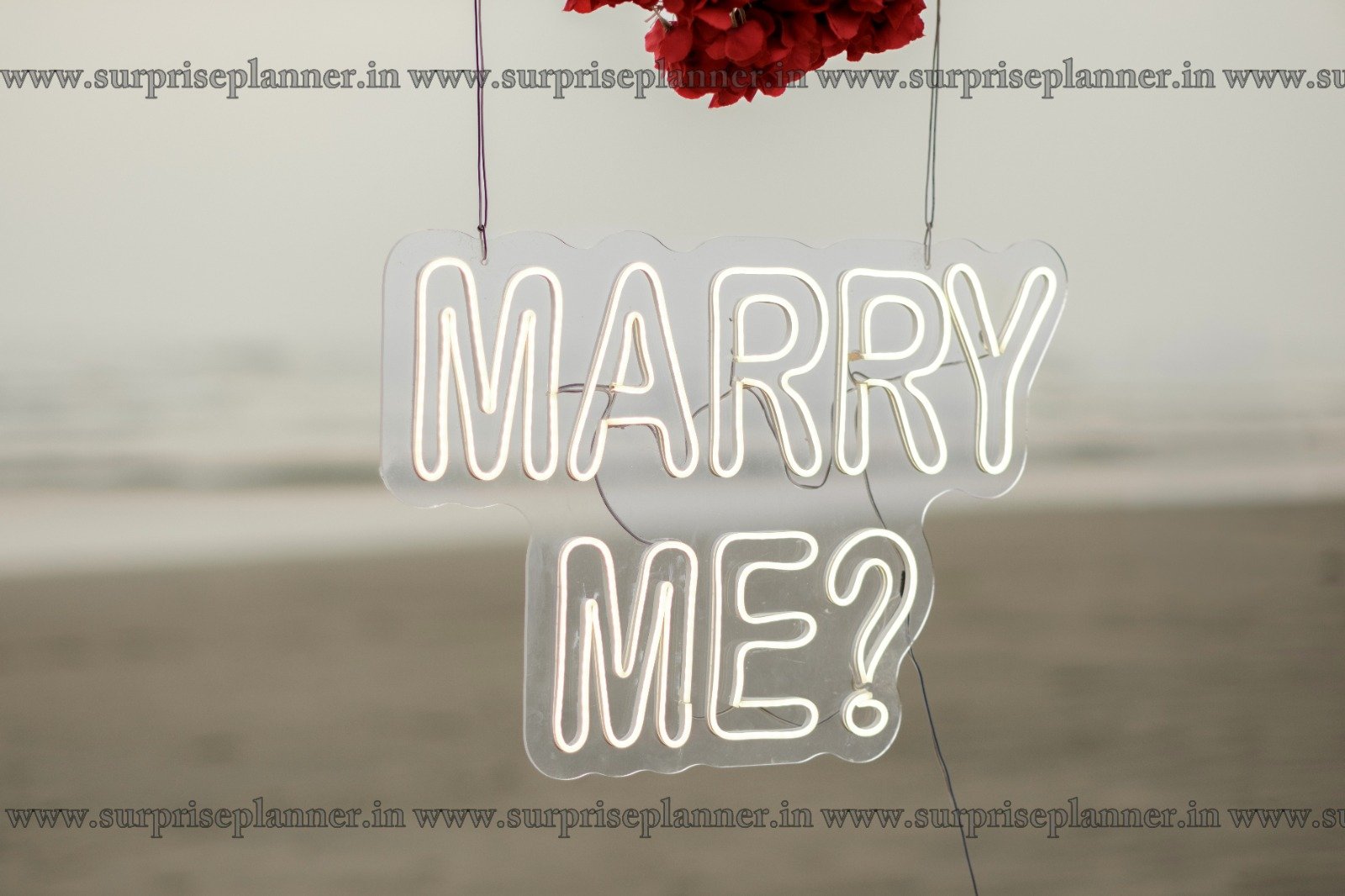 Make your dream proposal come to life with this breathtaking beachside “Will You Marry Me?” setup in Goa by Surprise Planner. As the sun sets over the shimmering waves, a magical moment unfolds — a red floral heart arch glowing with “Marry Me?” lights, candle-lit pathway, and soft music playing in the background.